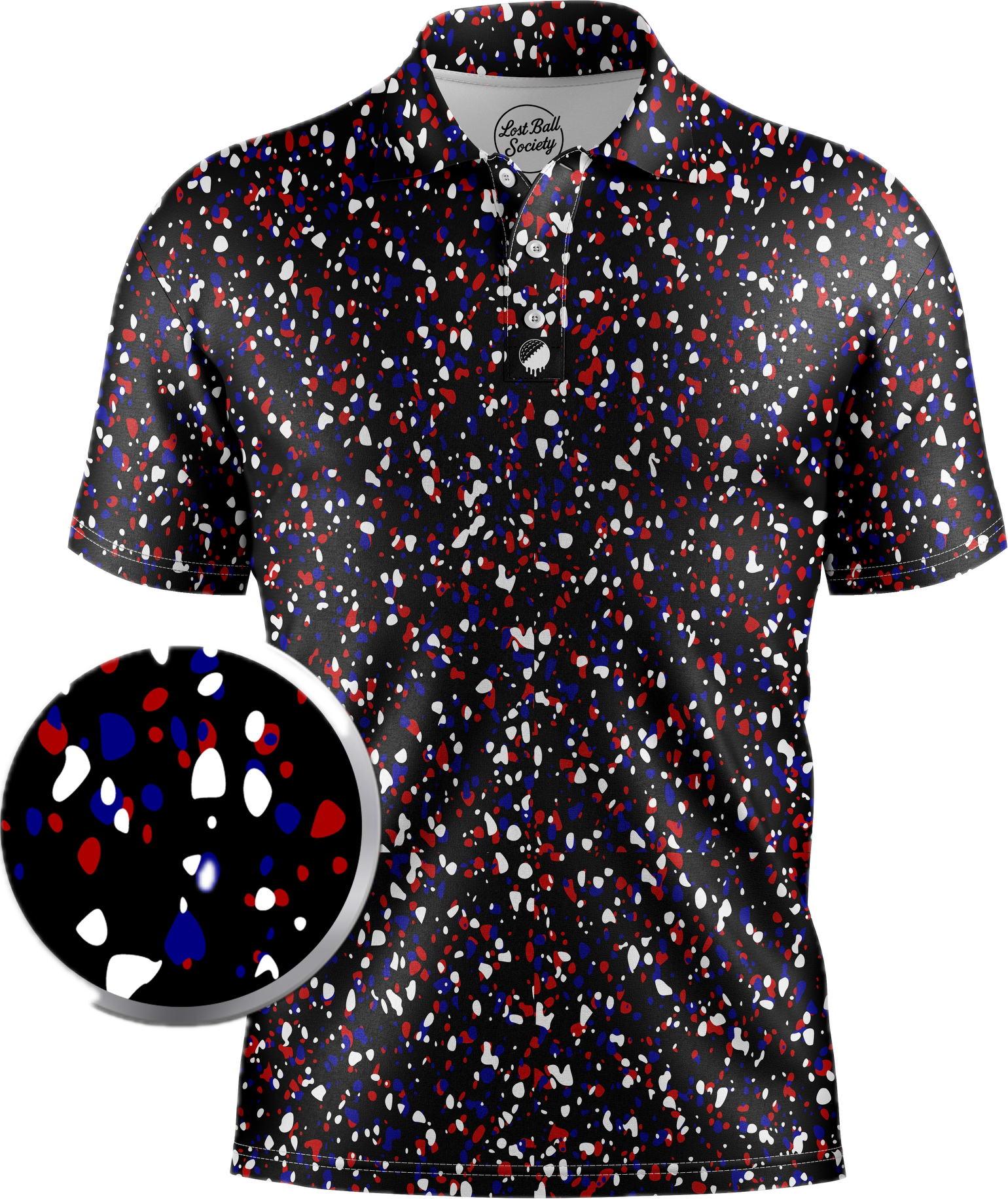 Stand out on the tee box with the Patriot Pebble Polo — a bold, chaotic splash of red, white, and blue scattered across a deep black canvas. This all-over pattern looks like a confetti explosion collided with a fireworks show and somehow landed perfectly on a golf polo. Lightweight, breathable, and built for comfort, it’s designed for golfers who like their fits loud, their drives long, and their attitudes unapologetically American.